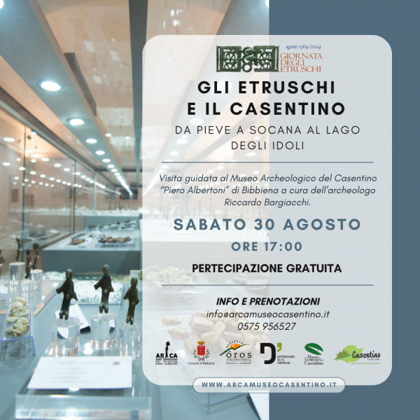 - Sabato 30 agosto ore 17:00 - Gli Etruschi e il Casentino: da Pieve a Socana al Lago degli Idoli – Visita guidata a cura dell’archeologo Riccardo Bargiacchi